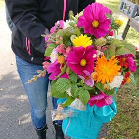 Under säsong erbjuder vi floristledd kurs i blomsterbinderi med självplock, rundor i odlingarna och gårdsbesök.